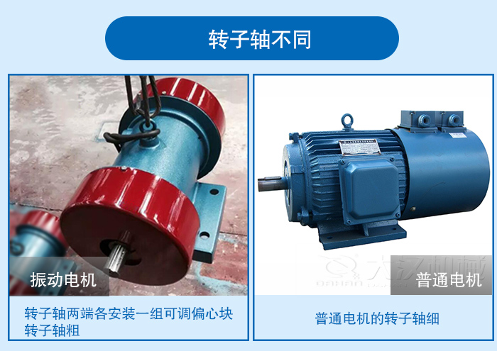 三、振動電機和普通電機的內部結構相同。主要差別是振動電機在轉子軸兩端各安裝一組可調偏心塊,利用軸及偏心塊高速旋轉產生的離心力得到激振力。振動電機比普通電機的機械和電氣方面都要求有可靠的抗震能力。同樣功率等級的振動電機的轉子軸要比同級別普通電機的軸粗得多。就是為了滿足實際工作條件的要求,這是主要區別。