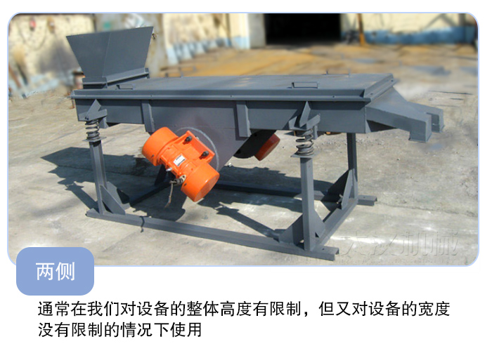 這種安裝方式也是直線振動(dòng)篩設(shè)備振動(dòng)電機(jī)較為采用的方法。通常在我們對(duì)設(shè)備的整體高度有限制,但又對(duì)設(shè)備的寬度沒有限制的情況下使用。比如因?yàn)橐恍┪锪系奶厥庖螅O(shè)備的出料口不能離地太高啦,在這種情況我們?nèi)绻烧駝?dòng)電機(jī)安裝在直線篩的底部或者頂部,那么設(shè)備的整體高度就不好控制了。一般來說直線篩的篩箱的高度通常是一定的,所以我們不能對(duì)篩箱的高度做調(diào)整,這是就可以考慮將振動(dòng)電機(jī)安裝在直線篩的兩側(cè),這樣可以大大的降低設(shè)備的整體高度,又不影響設(shè)備的工作效率。