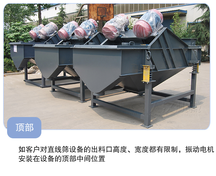 這種安裝方式在HYSF系列直線振動(dòng)篩中是不常見,很少有人這么做,不過HYS直線篩通常采用這種安裝方式,如客戶對(duì)直線篩設(shè)備的出料口高度、寬度都有限制,那么振動(dòng)電機(jī)不論是安裝在底部仍是兩側(cè)都不能達(dá)到要求,這時(shí)就可以將振動(dòng)電機(jī)安裝在設(shè)備的頂部中間位置,這樣既不增加設(shè)備的寬度,又不影響降低設(shè)備出料口的高度。