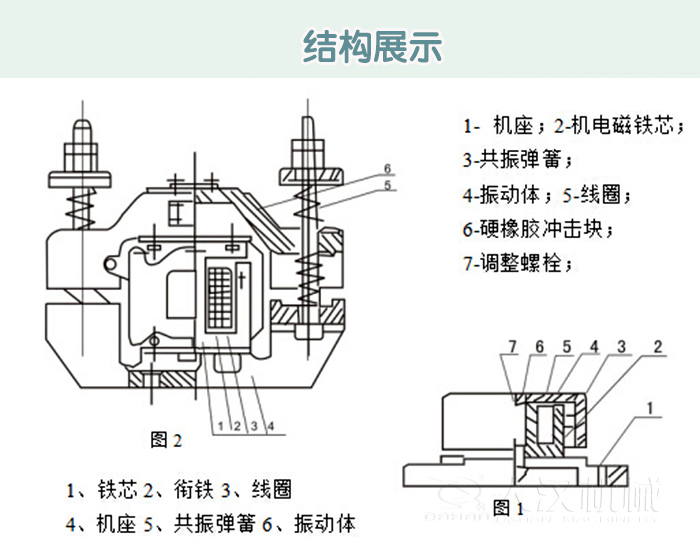 倉壁振動器由振動體、共振彈簧、電磁鐵、底座等部件組成。